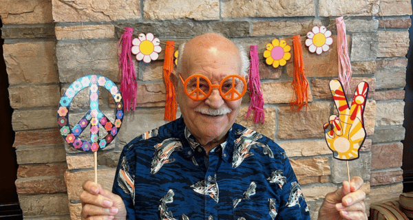 Residents and staff participated by dressing in their best hippie-inspired attire – adorned in bright floral prints, peace signs, and fringe. Licensed Instructor Alyssa led a peace-and-love-inspired Zumba class with a special 1960s- and 1970s-era playlist. Then residents made tie-dye shirts with Lifestyle Coordinator Brittany and Patty, and enjoyed tie-dye cookies and a 1960s trivia game for afternoon social.