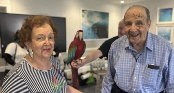 The Long Island Parrot Society presented a fascinating array of colorful companions, transfixing the attentions of residents and team members alike. A dazzling, extraverted macaw stole the show, while a snowy-white cockatoo charmed everyone with a more gentle personality, perching with residents who wished to get a closer look.